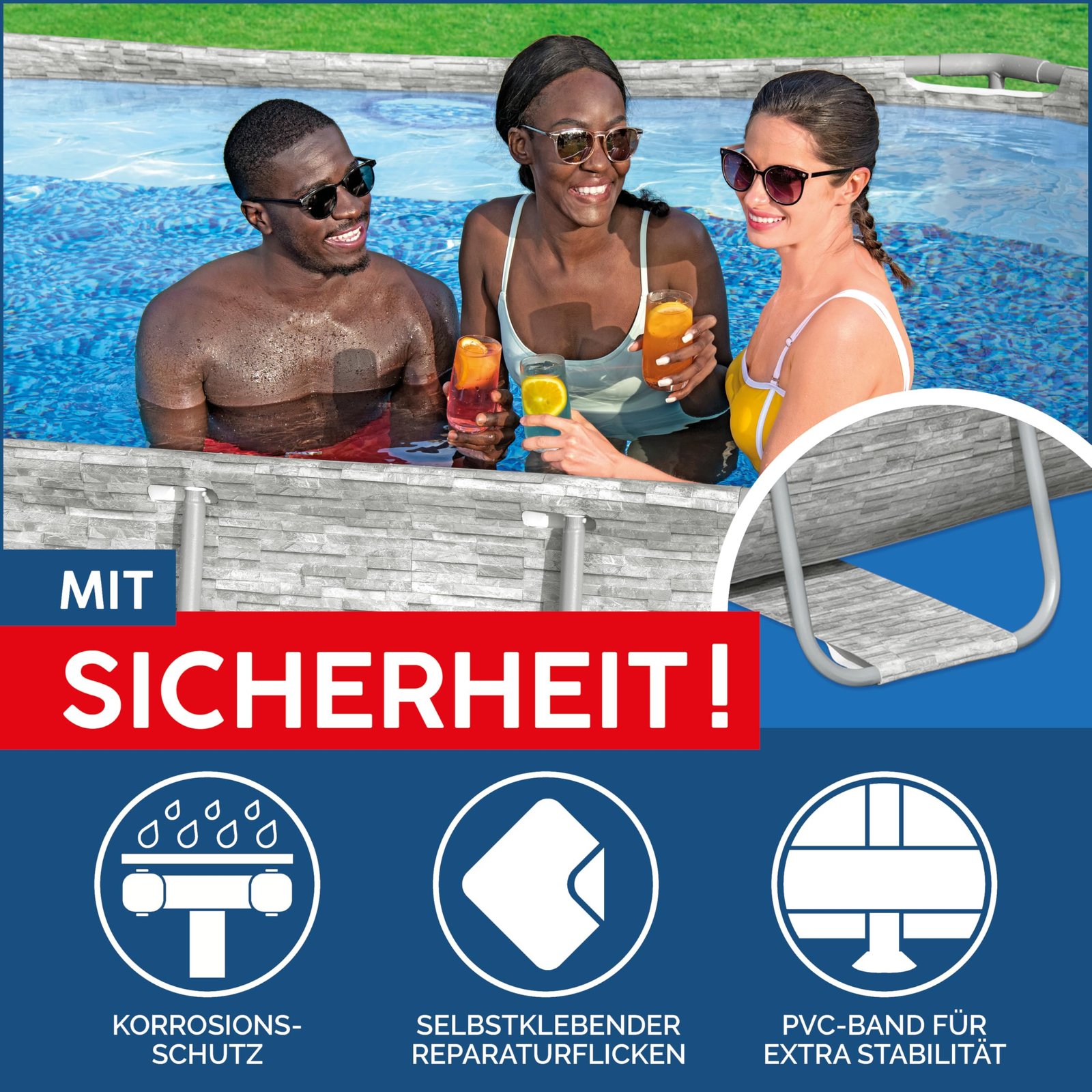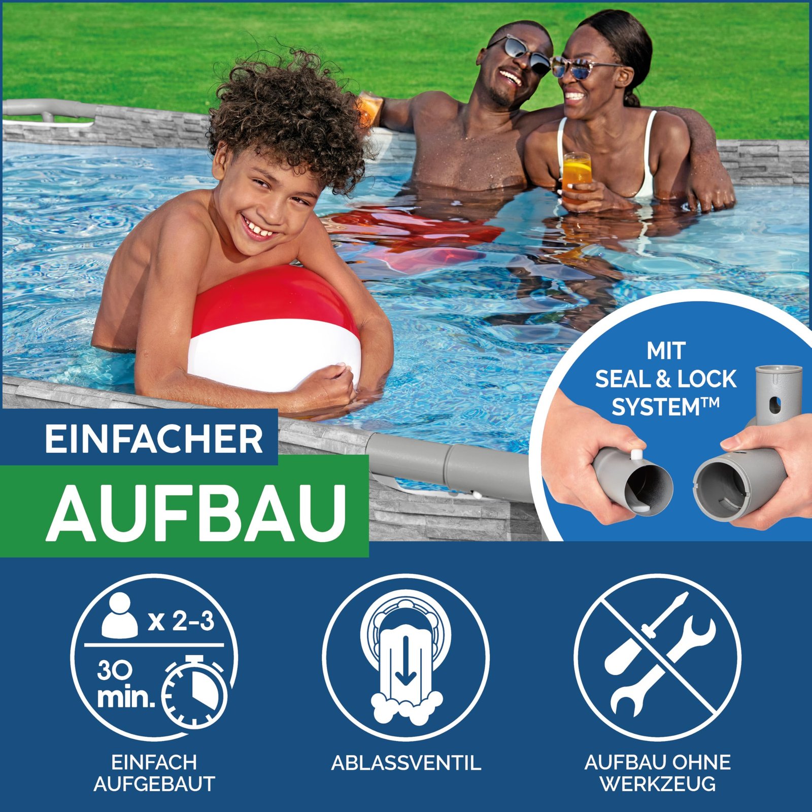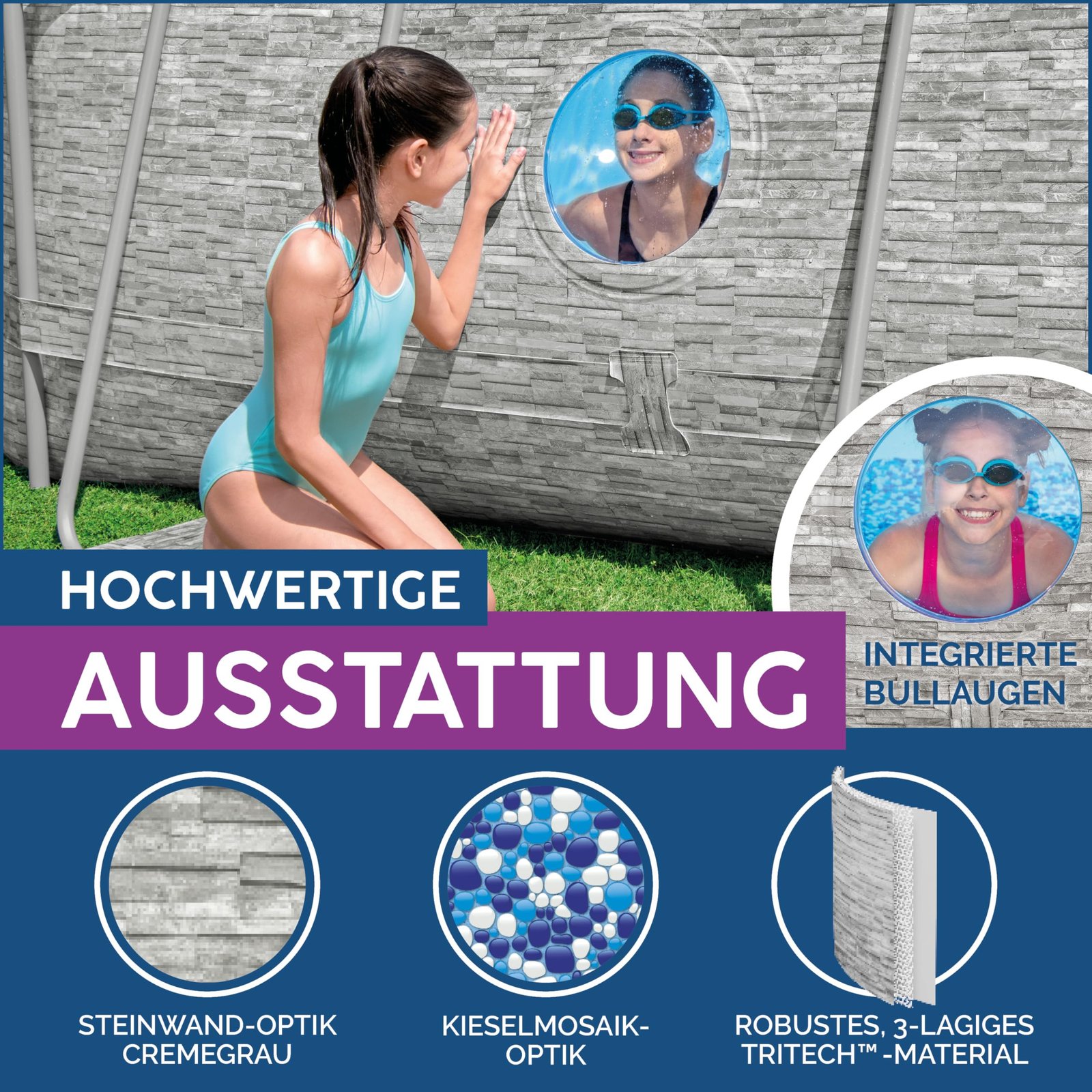 Produktdetails Größe: 427 x 250 x 100 cm Max. Aufbaumaß: 427 x 290 cm Wasserkapazität zu 90 % gefüllt: 7.250 Liter Poolfolie aus robustem, 3-lagigem TriTech™-Material 2 integrierte Fenster in den Poolwänden Farbe: Moderne Rattan-Optik Boden in Fliesen-Optik Einfacher Aufbau ohne Werkzeug möglich Extrem starre Rahmenkonstruktion mit Korrosionsschutz für erhöhte Festigkeit und Haltbarkeit Seal & Lock™ Stahlrahmen-Verbindungssystem zum Schutz vor Wassereintritt in das Gestänge Erhöhter Widerstand durch flexible T-Verbinder an den Poolecken PVC-Band sorgt für extra Stabilität der Seitenwände Integriertes Ablassventil mit Gartenschlauchadapter Inklusive: