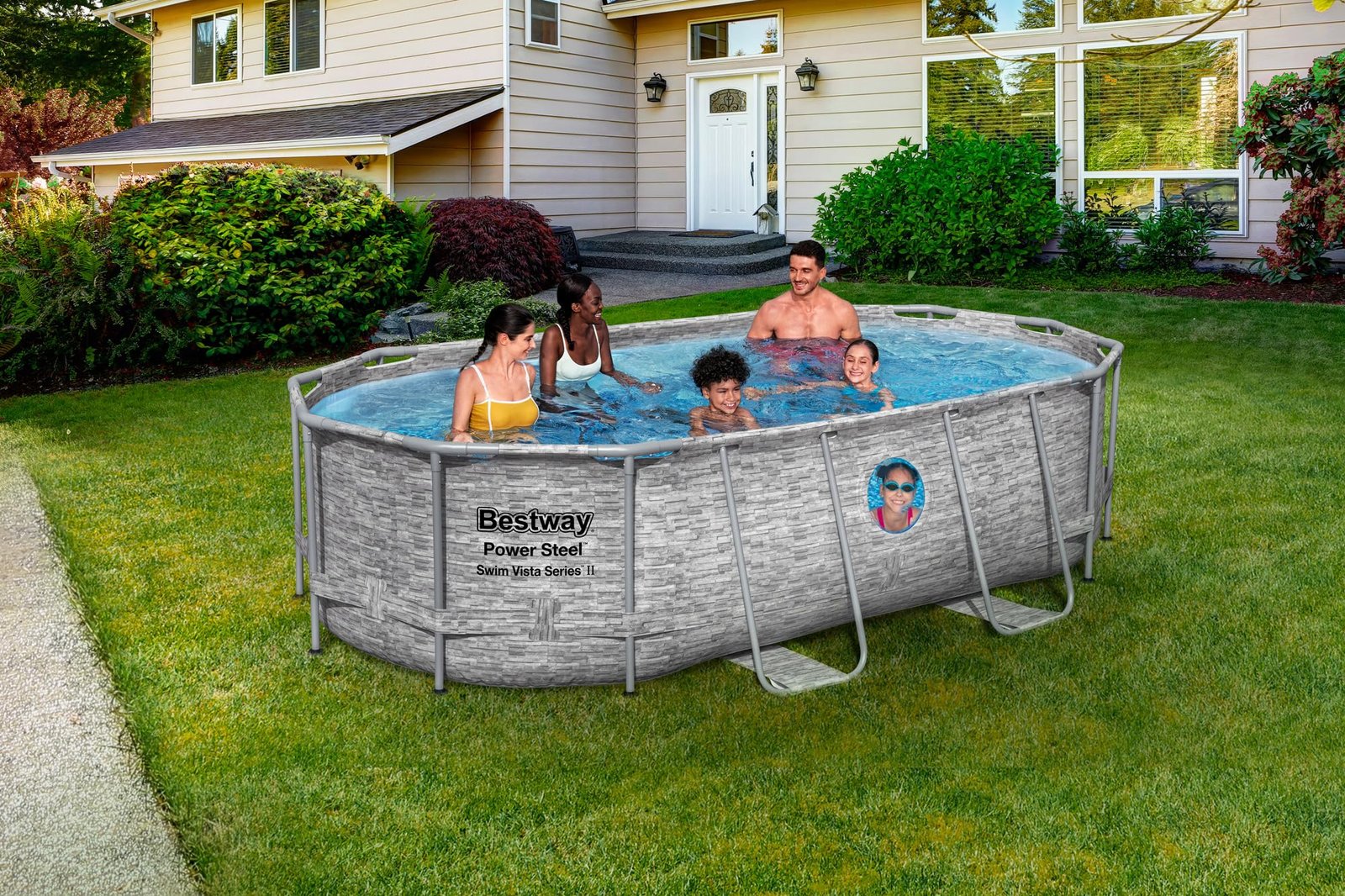 Die Bestway® Power Steel™ Swim Vista Series™ II ist die zweite Generation des weltweit ersten Aufstellpools mit integrierten Bullaugen und bietet ein einzigartiges Schwimmerlebnis mit Durchblick. Swim Vista Bullaugen Die verstärkten Bullaugen in den Seitenwänden machen einfach Spaß und dienen Eltern zudem als zusätzliche Aufsichtsmöglichkeit. Der Aufbau ist dazu ein absolut echtes Kinderspiel. Robuste Konstruktion Das patentierte Seal & Lock™ System sorgt für eine sichere Verbindung der einzelnen Stahlrahmenelemente. Das reißfeste TriTech™ -Material verleiht dem Pool eine enorme Langlebigkeit. Durch die natürliche Rattan-Optik erhält Ihr Garten einen besonderen Glanz.