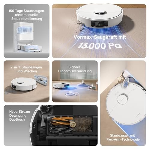 Dank des verbesserten 5-Liter-Staubbeutels und des automatischen Staubaufnahmesystems entleert sich der Roboter selbstständig – bis zu 150 Tage ohne manuelle Entleerung. Das bedeutet weniger Wartung und mehr Komfort im Alltag.