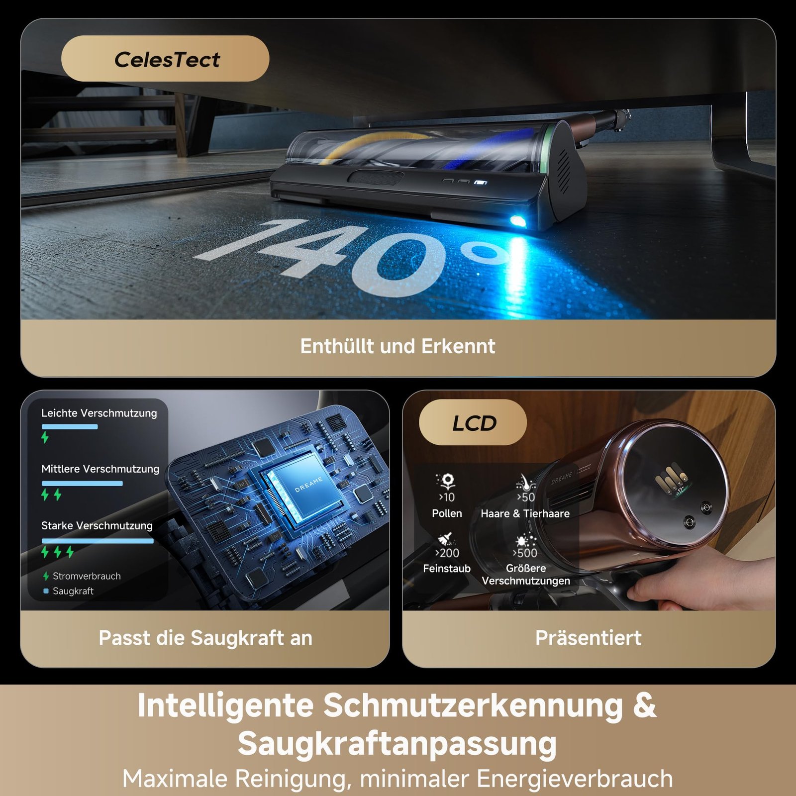 Die integrierte 140° CelesTect LED-Beleuchtung macht selbst feinste Staubpartikel sichtbar und sorgt für eine noch gründlichere Reinigung.