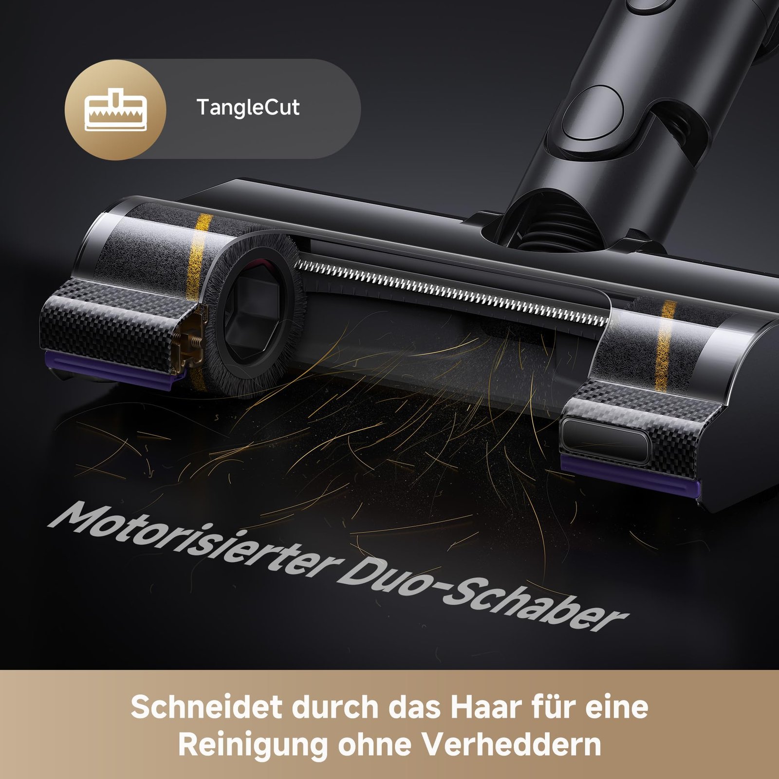 Statt herkömmlicher Anti-Verhedderungskämme setzt der V30 auf zwei motorisierte Schaber, die Haare während des Saugens aktiv durchtrennen. Das Ergebnis: eine dauerhaft freie Bürstenrolle ohne manuelles Entfernen von Haaren – ideal für Haustierbesitzer.