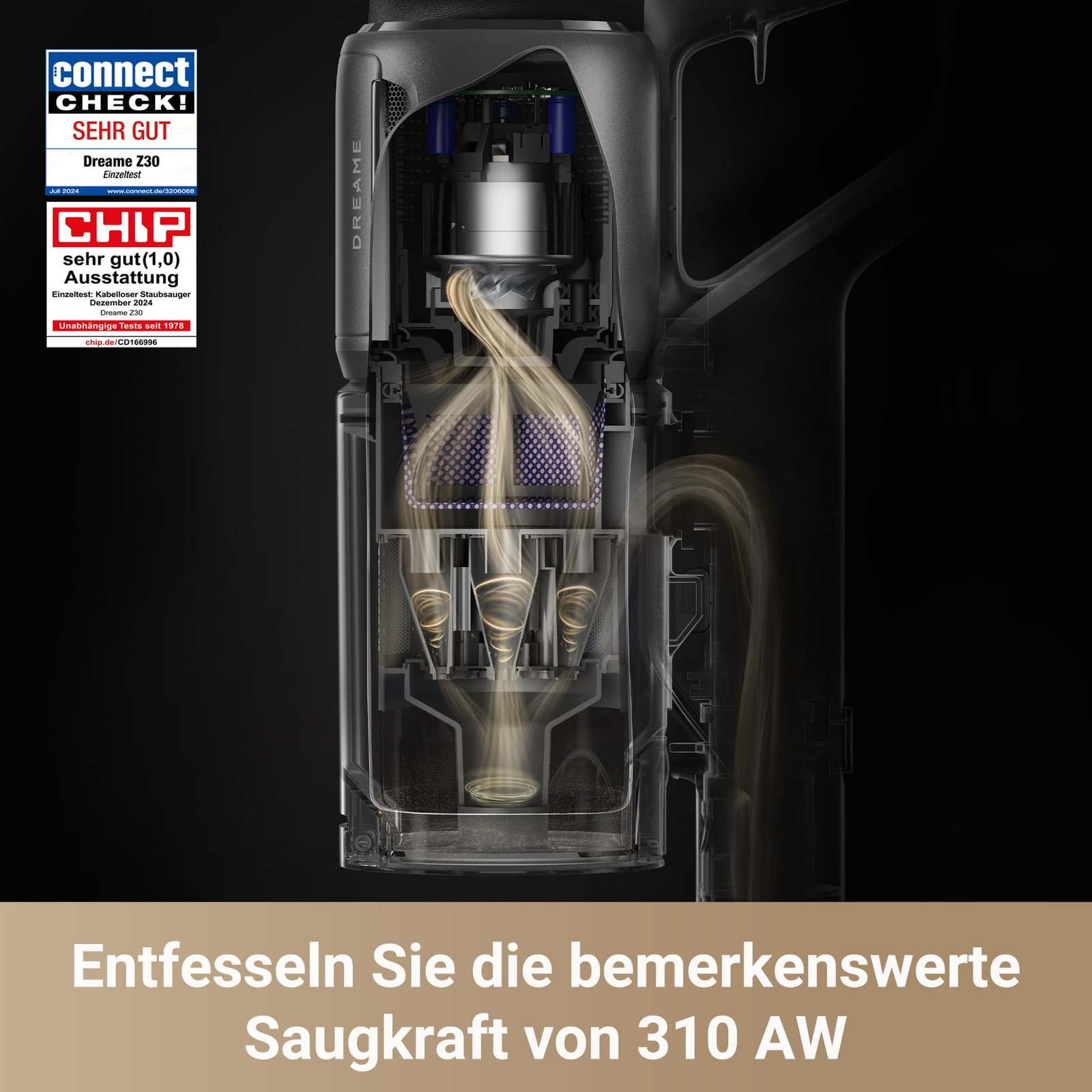 dreame Z30 Kabelloser Staubsauger 310 AW / 28.000 Pa, 90 Min Laufzeit, HEPA 14 Filter, Dust-Reveal-Technologie, Tierhaar-Tool, Multi-Oberflächen, Schwarz