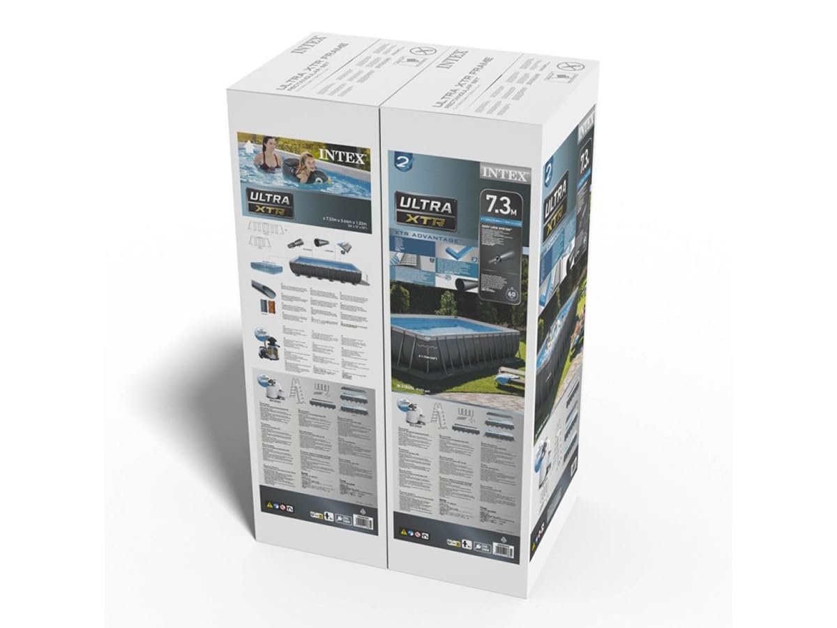 Entdecken Sie das maximale Pool-Erlebnis mit unserem innovativen Frame Pool Set Ultra Quadra XTR 732 x 366 x 132 cm. Mit der klassischen rechteckigen Form, einem eleganten dunkelgrauen Außenfutter und dem wasserblauen Flieseninnendruck, ist Ihr Pool der INTEX Ultra XTR Premium Pool Serie ein absoluter Hingucker.